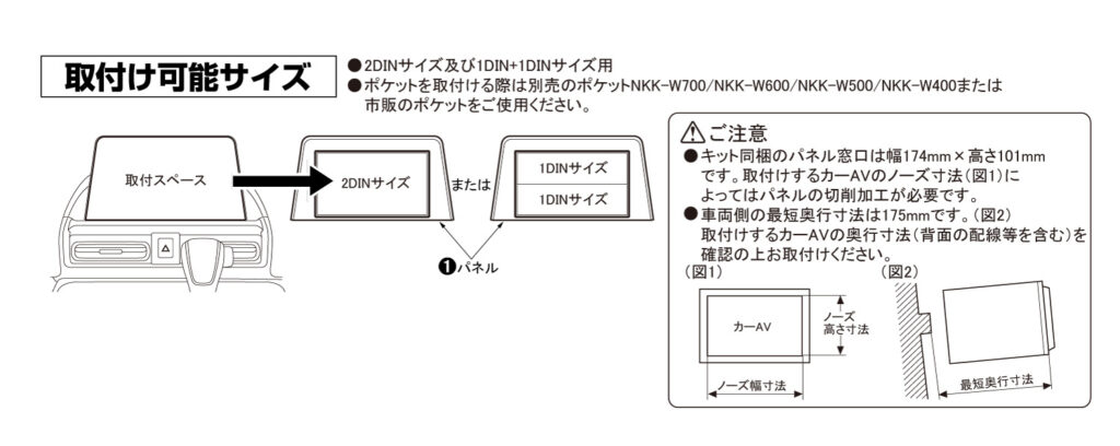 NKK-H101D 2025年12月16日 最終更新日時 : 2025年12月19日 suzukie オーディオレス車(ナビ装着用スペシャルパッケージ付車)に市販の2DINまたは1DIN+1DINを取付けるためのキットです。